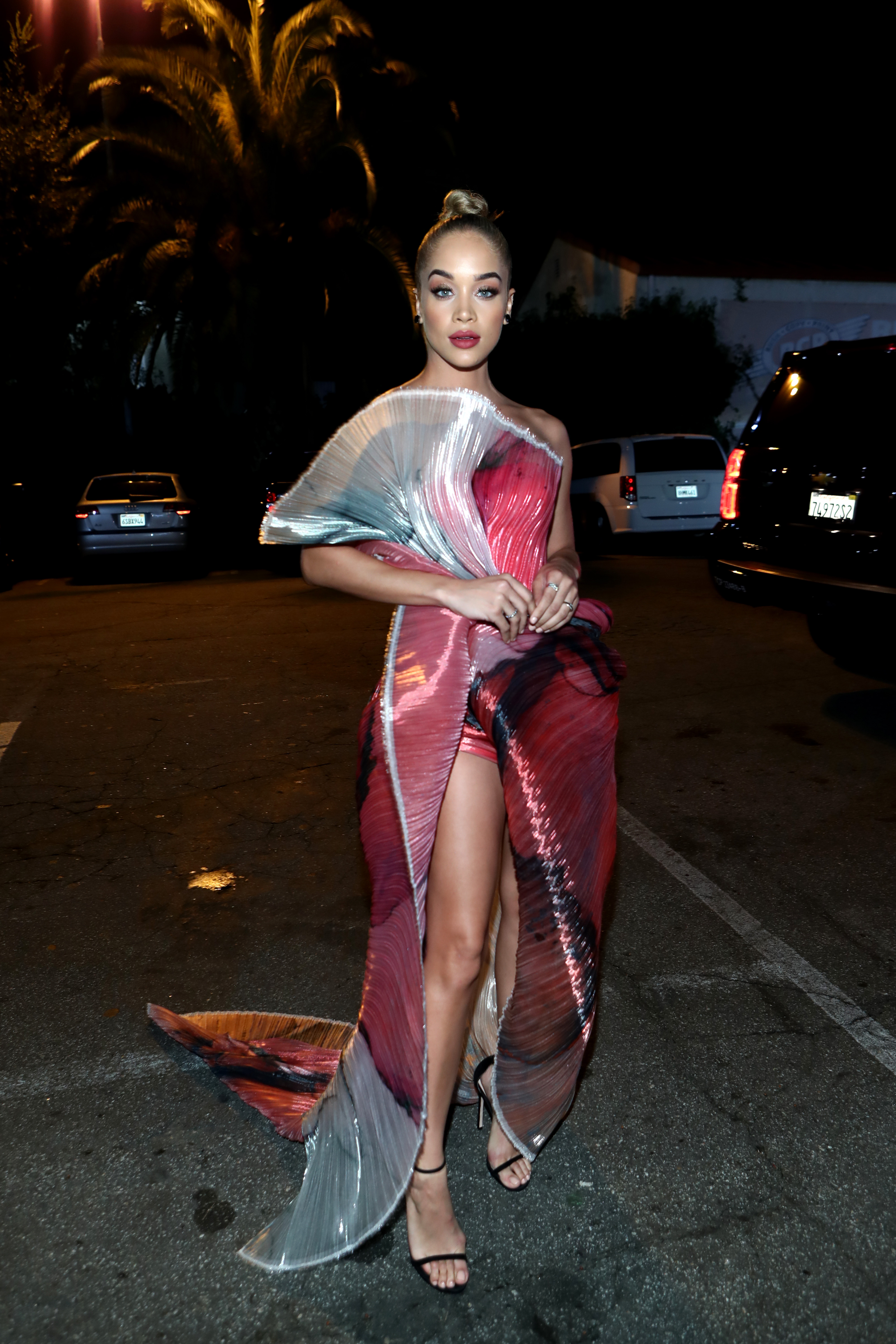 Jasmine Sanders, The Art of Elysium’un 13. kutlamasına Maison Met’ten volanlı bir elbise giydi.