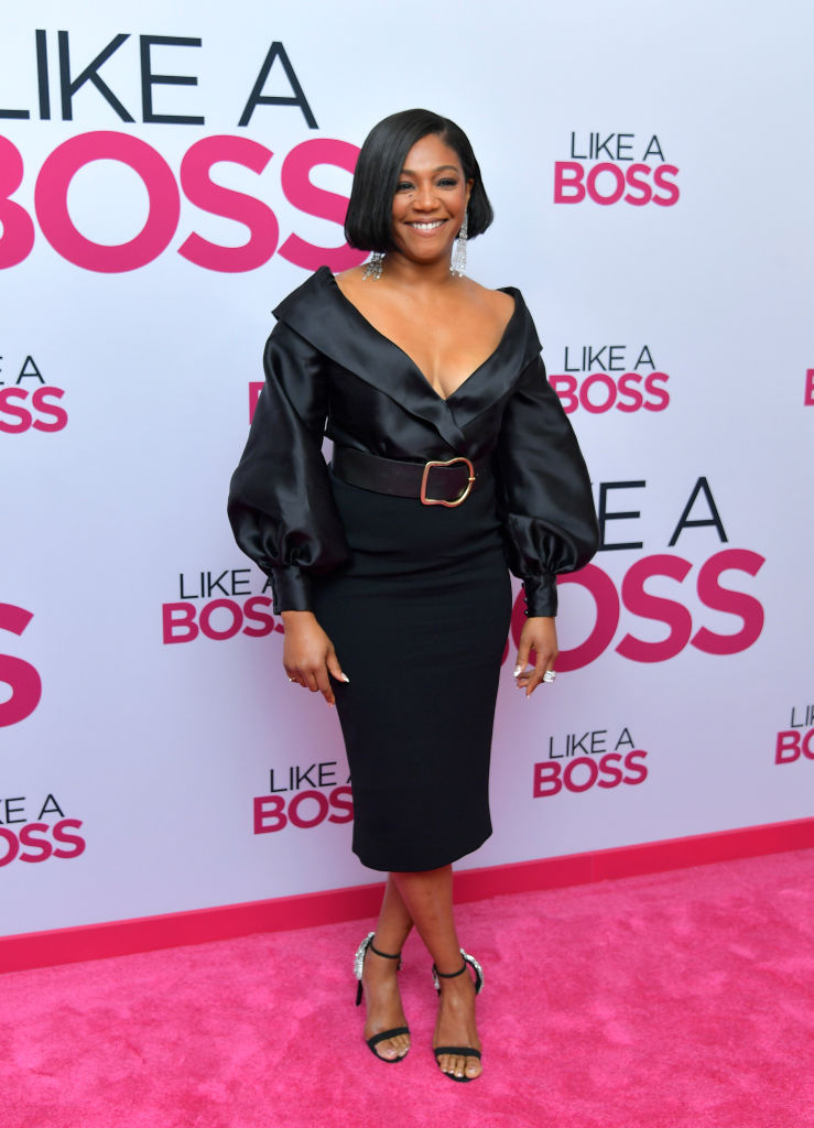 Tiffany Haddish, ‘Like A Boss’ filminin New York gösterimi için Sergio Hudson’dan özel dikim siyah bir elbise giydi.