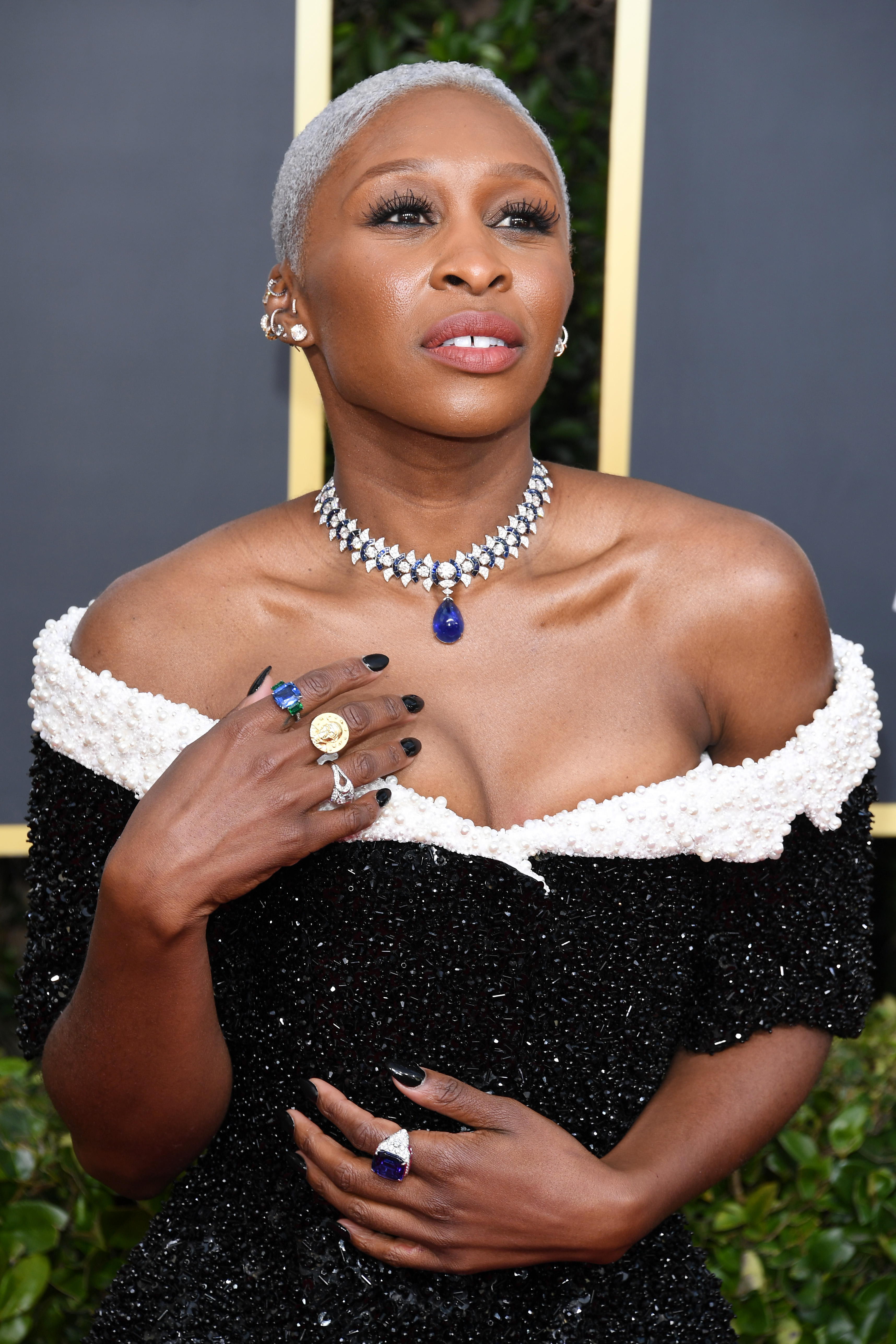 En iyi oyuncu ve en iyi orijinal şarkı adayı Cynthia Erivo 77. Golden Globes Ödül Töreni’nde BVLGARI High Jewelery Koleksiyonu’ndan 3 milyon dolar değerindeki kolyeyi High Jewelery küpeleri ve yüzükleriyle tamamladı.