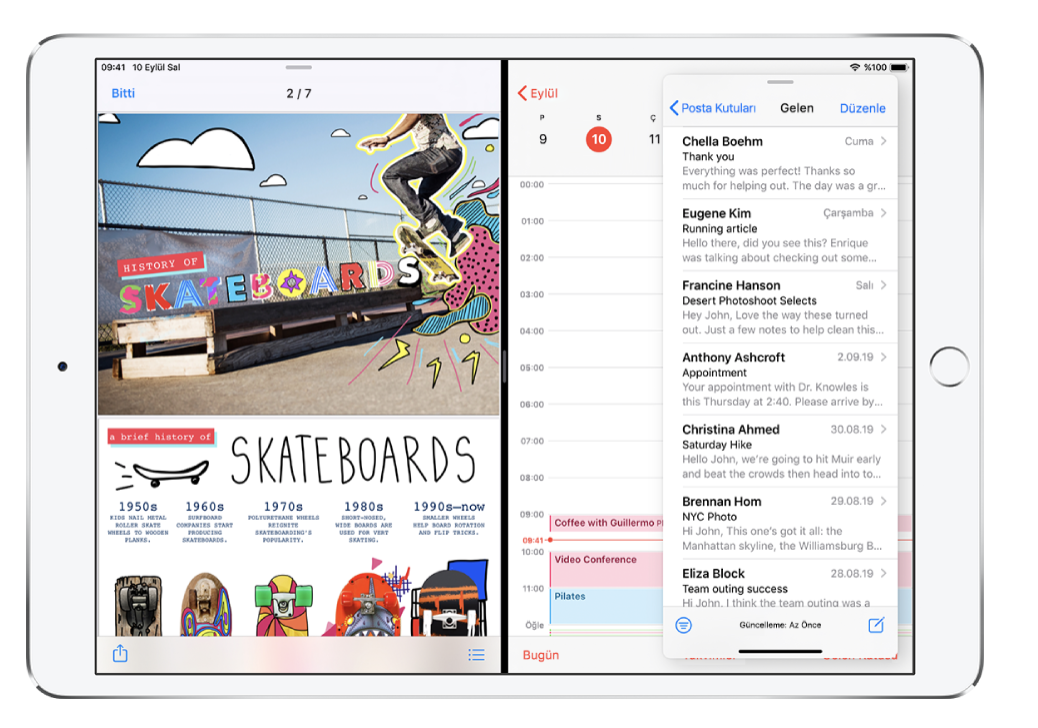 iPadOS, iPad’de çalışmak için Multitasking ile yepyeni bir yol sunuyor. Kullanıcılar şimdi Slide Over özelliği sayesinde birden fazla uygulamada çalışabilir ve uygulamalar arasında hızla geçiş yapabilir. Split View ile de aynı anda iki dosyayı görüntüleyebilir veya işle ilgili birden fazla pencere açabilir.