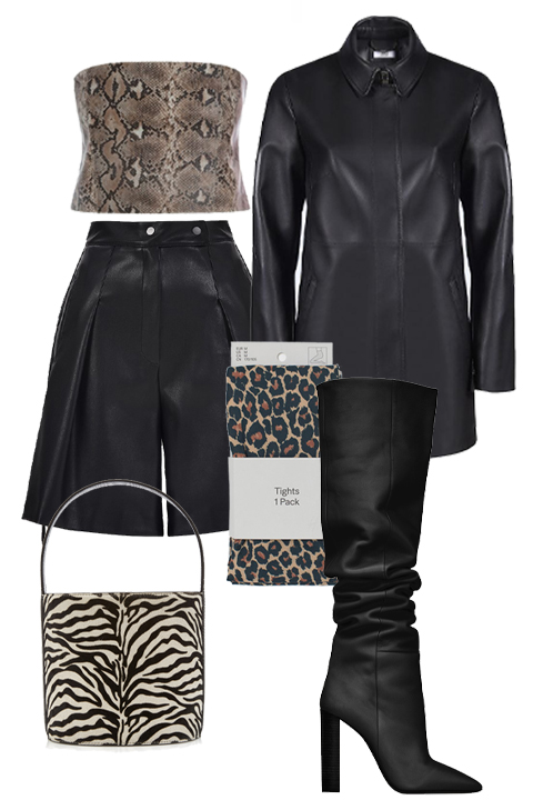 Tom Ford’un Sonbahar Kış 2018 defilesi, desenli külotlu çorapların sükse yapmasına sebep olmuştu! Bu unutulmaz defileden ilham alarak vahşi desenleri bir araya getiriyoruz. Tıpkı Tom Ford’un defilesinde olduğu gibi korkusuzca birçok farklı vahşi deseni bir arada kullandık. Burada önemli olan tonların birbirine yakın olması ve kıyafetinizin geri kalanının aynı renklerde olması. Sokak modasının ‘statement’ parçasına dönüşen deri bermuda şortları ve deri blazer ceketleri, yılan derisi desenli bir büstiyer, zebra desenli bir çanta ve leopar desenli külotlu çoraplar ile eşleştirdik. Hem son dönemin ‘it’ parçalarını kullanarak hem de desen trendlerinden faydalanarak, oldukça havalı görünümler yaratabilirsiniz.