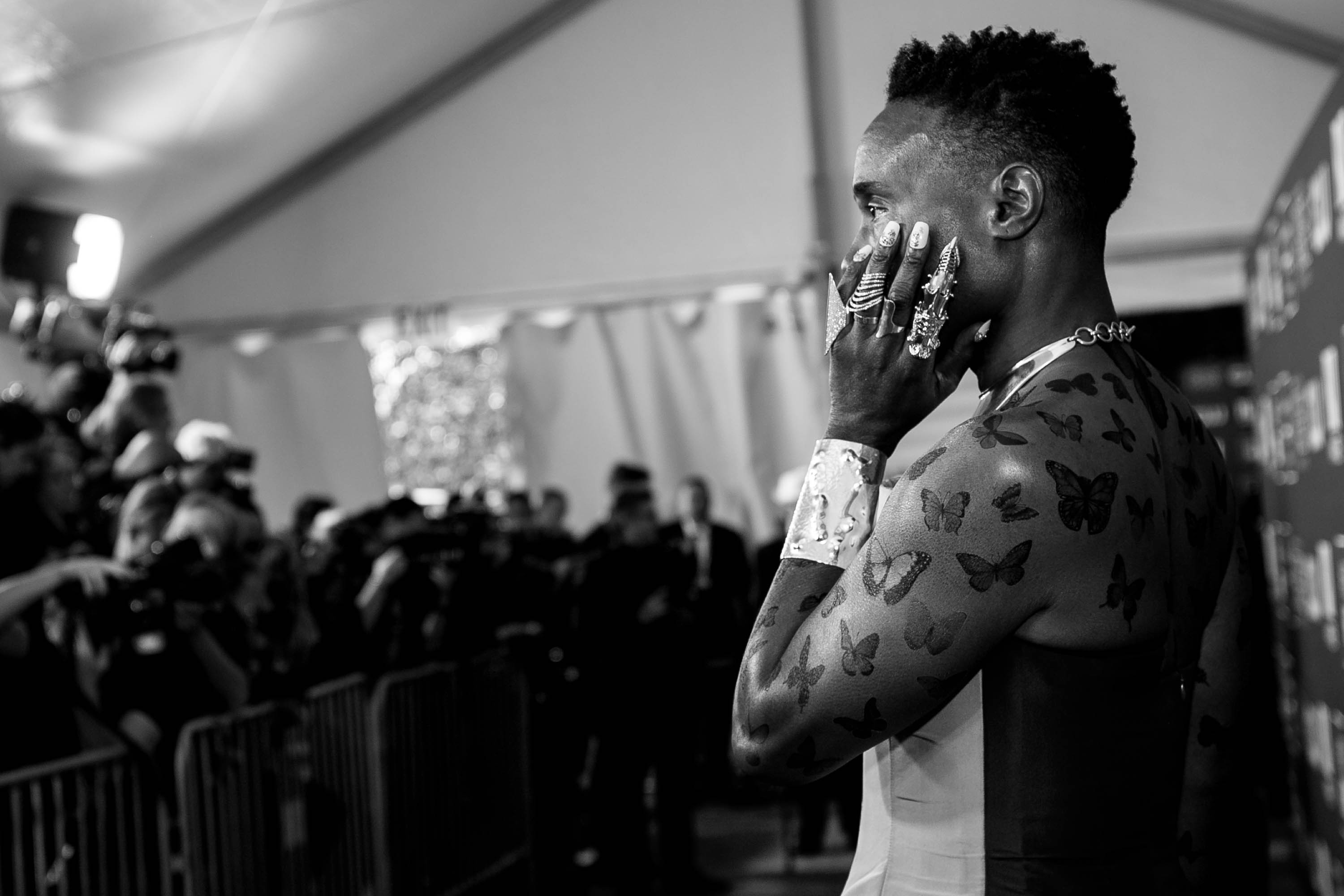 Netflix'te yayınlanan Pose'un başarılı oyuncusu, Hogan McLaughlin imzalı; iki tondan oluşan, sadece kollarını açıkta bırakan straplez bir tuvalet giydi. Görünümünü gümüş bir choker ve bir sürü kelebek dövmesi ile tamamladı.