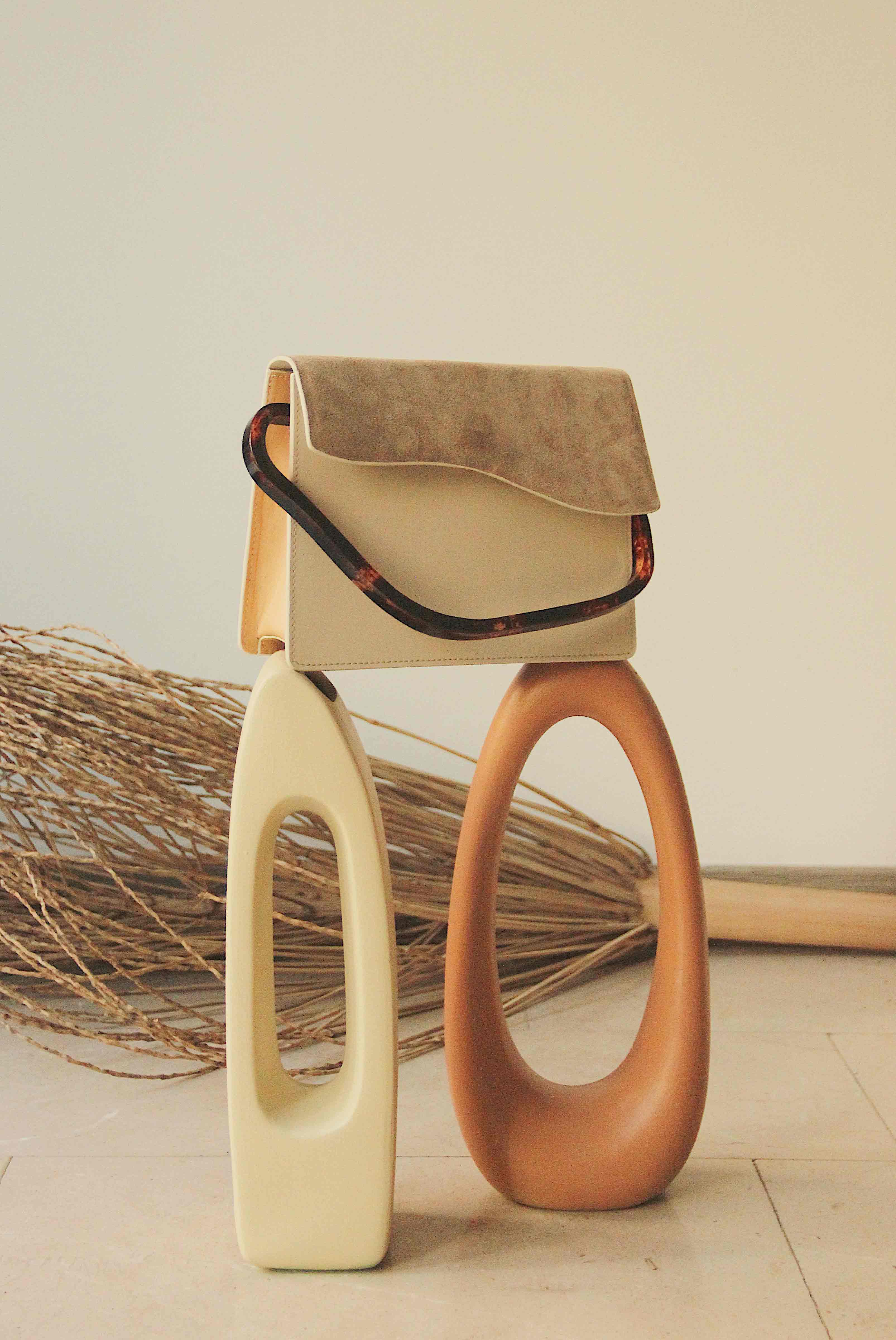 Rastlantısal organik formlardan ilham alarak bu formlara tezat yaratan minimal geometrik hatları olan çantalar üretiyoruz. Modern ve kullanım kolaylığı sağlayan deri gövdeler, markanın DNA’sı olan her biri birbirinden farklı el işçiliğiyle oluşturulmuş reçine sapları ile tamamlanıyor. Bu noktada kullandığımız materyaller bizim için çok önemli, çünkü sürdürülebilirlik en öncelikli hedefimiz. Derileri vegetal tabaklama yöntemiyle tamamlanıyor. Bunlar yüksek kalitede besi hayvanlarının derileri. Marka hiçbir şekilde gerçek kürk ya da tropik hayvan derisi kullanmıyor. Reçineler de seri üretim tekniklerinden uzak çevreci bir ortamda hazırlanıyor. Reçine saplarını onlarca yetenekli kadın el emeği olarak üretiyor. Renkler de doğal bir karteladan seçiliyor.