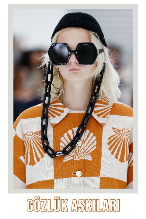 Yine naftalin kokulu bir trend daha! Büyüklerimizin gözlüklerini kaybetmemek için kullandıkları askılar ve zincirler bu sezonun en beklenmedik aksesuarlarından biri. Güneş gözlüklerini adeta bir takıya dönüştüren askılar, zincir ve boncuk formunda öne çıkıyor. Kolye takmadığınız günlerde güneş gözlüklerinizi bir takıya dönüştürebilirsiniz. Üstelik bu trendin en iyi yanı ise bir daha asla gözlüklerinizi kaybetmeyeceksiniz!