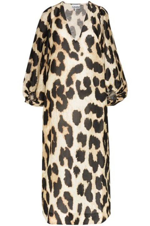V Yaka Leopar Desenli Midi Keten Elbise, 3,089 TL GANNI beymen.com