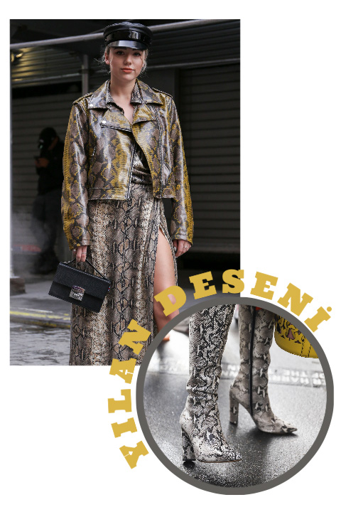 Öncelerde sadece ayakkabılarda ve çantalarda gördüğümüz yılan derisi deseni artık kıyafetlerde! Aksesuarların klasiği olan yılan derisi deseni kıyafetlere geçince modern bir klasik formunu aldı. Deri ceketlerde, elbiselerde, pantolonlarda ve eteklerde karşımıza çıkan yılan derisi desenleri modanın yeni favorileri arasında.