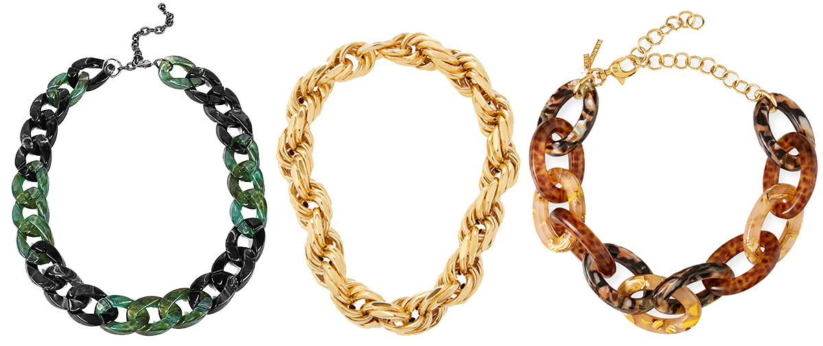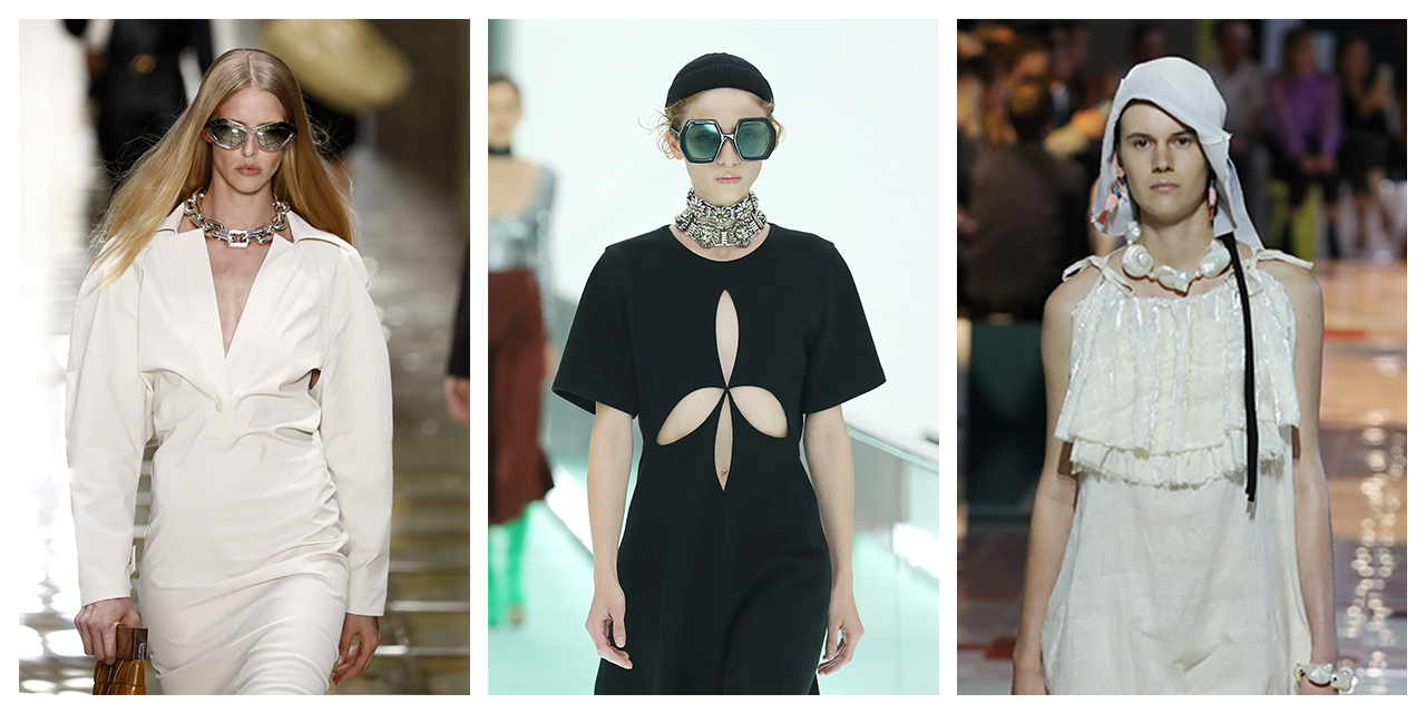 İlkbahar 2020’de minik ve zarif kolyelere elveda diyoruz. Statement küpelerin yerini kocaman yaka kolyeleri alırken, modadaki zincir furyasının devamını görüyoruz. Choker kadar kısa olmayıp yakada duran kocaman kolyeler, Bottega Veneta defilesinde zincir, Gucci defilesinde zırh ilhamlı ve Prada defilesinde oversized deniz kabuğu formunda görüldü.