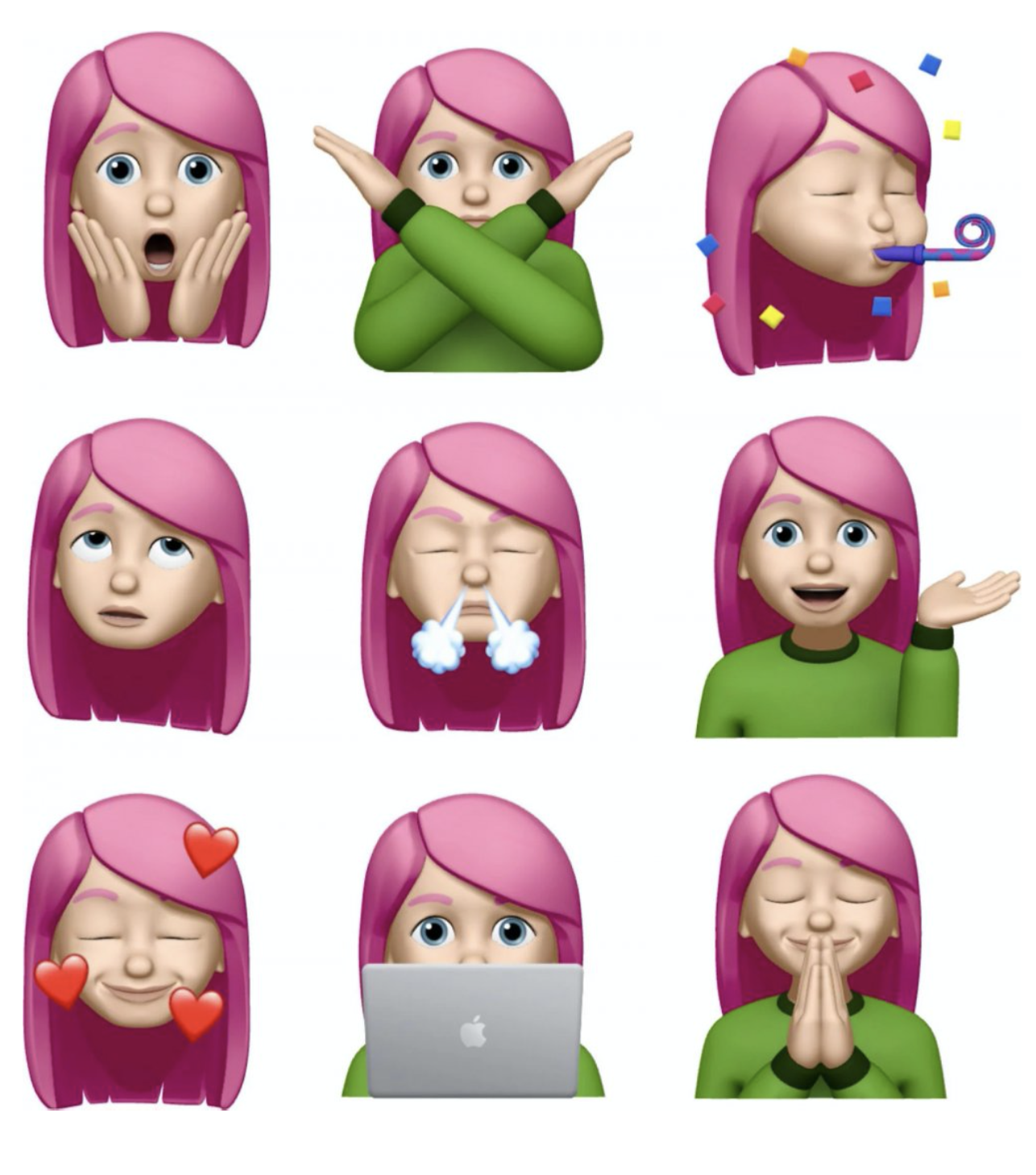 iOS 13.4 ve iPadOS 13.4’te Mesajlar, FaceTime ve klavyeyi destekleyen tüm uygulamalarda dokuz yeni heyecan verici Memoji çıkartması sizinle. Şimdi Memoji çıkartmalarını kullanarak kutlama yapmaktan gözlerinizi devirmeye veya öfkeyle oflamaya kadar birçok farklı şekilde kendinizi ifade edebilirsiniz. Hepsi popüler emojileri temel alan dokuz yeni ifade şöyle: