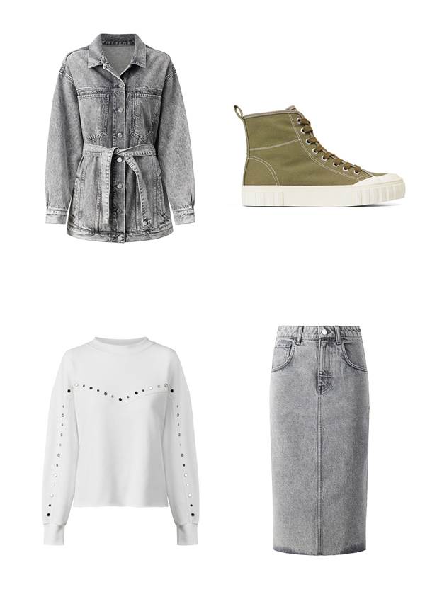 Yükselen denim trendi nedir? Şüphesiz asit yıkama denimler! Bu 80’li yıllar ilhamlı stil, beyaz sneakerlar ve desenli sweatshirtler ile sokak modasına uyuyor. Ceket ve uyumlu bir kalem etekten oluşan iki parça bir stil, daha havalı bir tasarımda yeniden yaratılıyor.