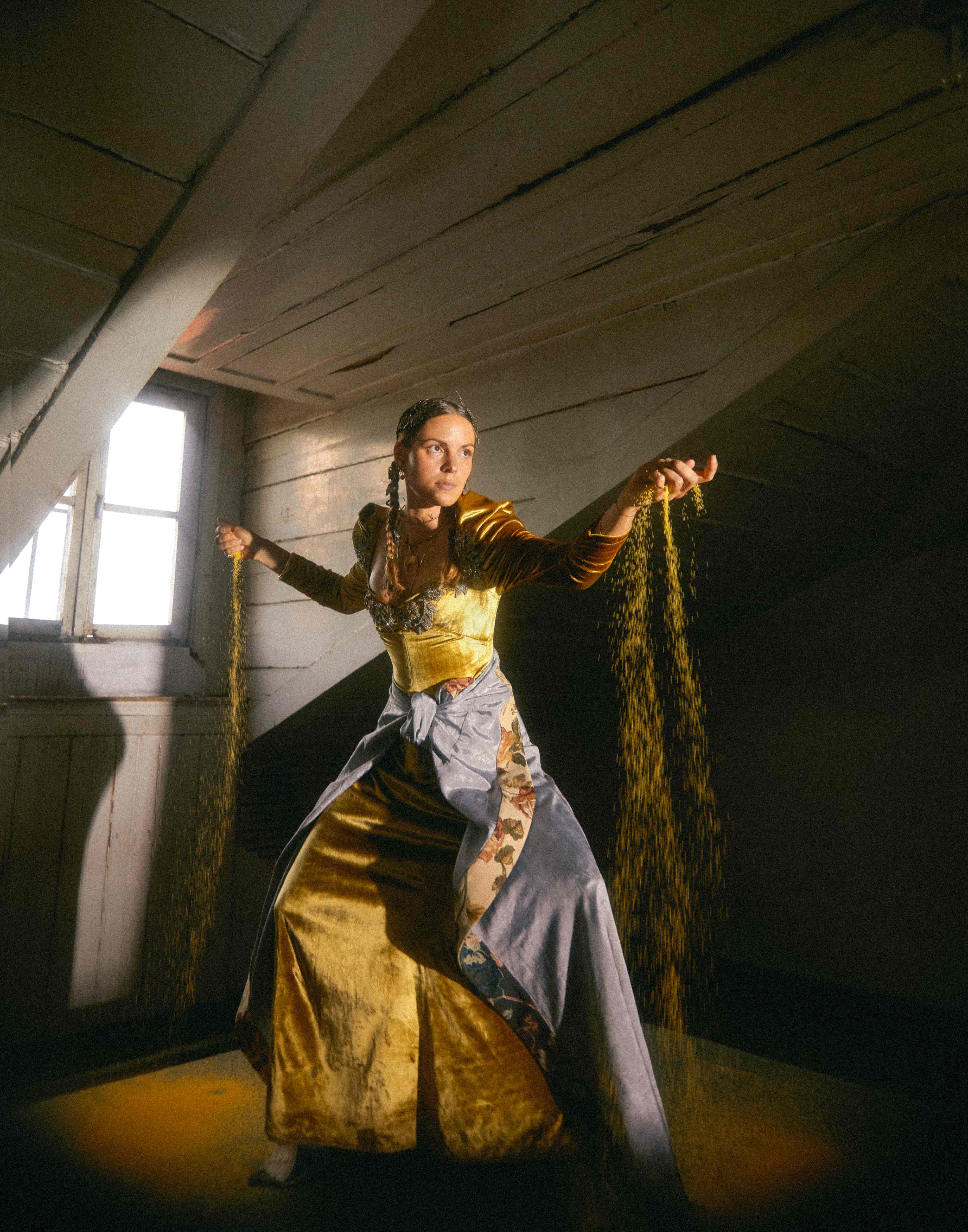 Kadife elbise, ŧ 8585, Kaftan, ŧ2845, ikisi de ASLI FİLİNTA. Taç, fiyatı istek üzerine, AIDA BERGSEN. Yüzükler (saçta), fiyatları istek üzerine, EXO BY ELA KÖSEOĞLU.Altın kaplama tasma, Altın kaplama kolye, Küpe (saçta), fiyatları istek üzerine, hepsi ZEITGEIST BY CHLOE. Uzun kolye, Küpe, Ayakkabı, hepsi kendisine ait.