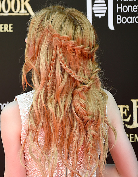 Oyuncu Katherine McNamara uzun dalgalı saçlarına farklı boyutta yaptığı örgüler ile harika görünüyor.