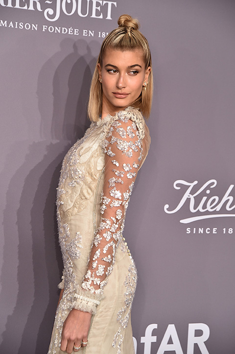 Hailey Baldwin saçın önünden başlayan mini örgüsü ve yarım topuzu ile objektiflere poz veriyor.