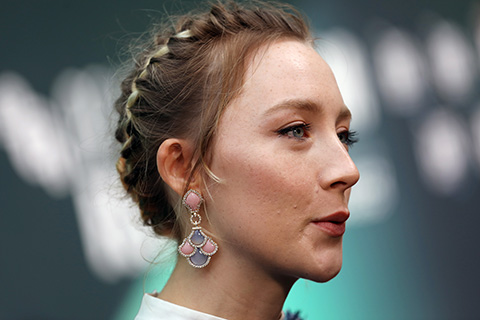 Oyuncu Saoirse Ronan örgülü toplu saçları ile bir bütünlük yakalıyor.