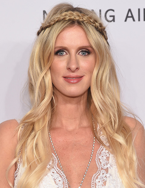 Nicky Hilton dalgalı saçlarına örgüyle bir taç yaparak zarif bir görünüm elde ediyor.