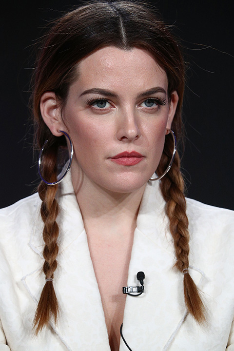 Riley Keough çabasız ve iki yana ayırdığı örgüsü ile objektiflerde.