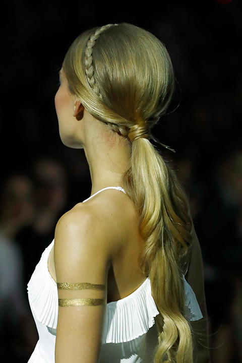 Heidi Klum saçını at kuyruğu yaptıktan sonra örüyor ve örgüyü saçıyla birleştirerek farklı bir yorum katıyor.