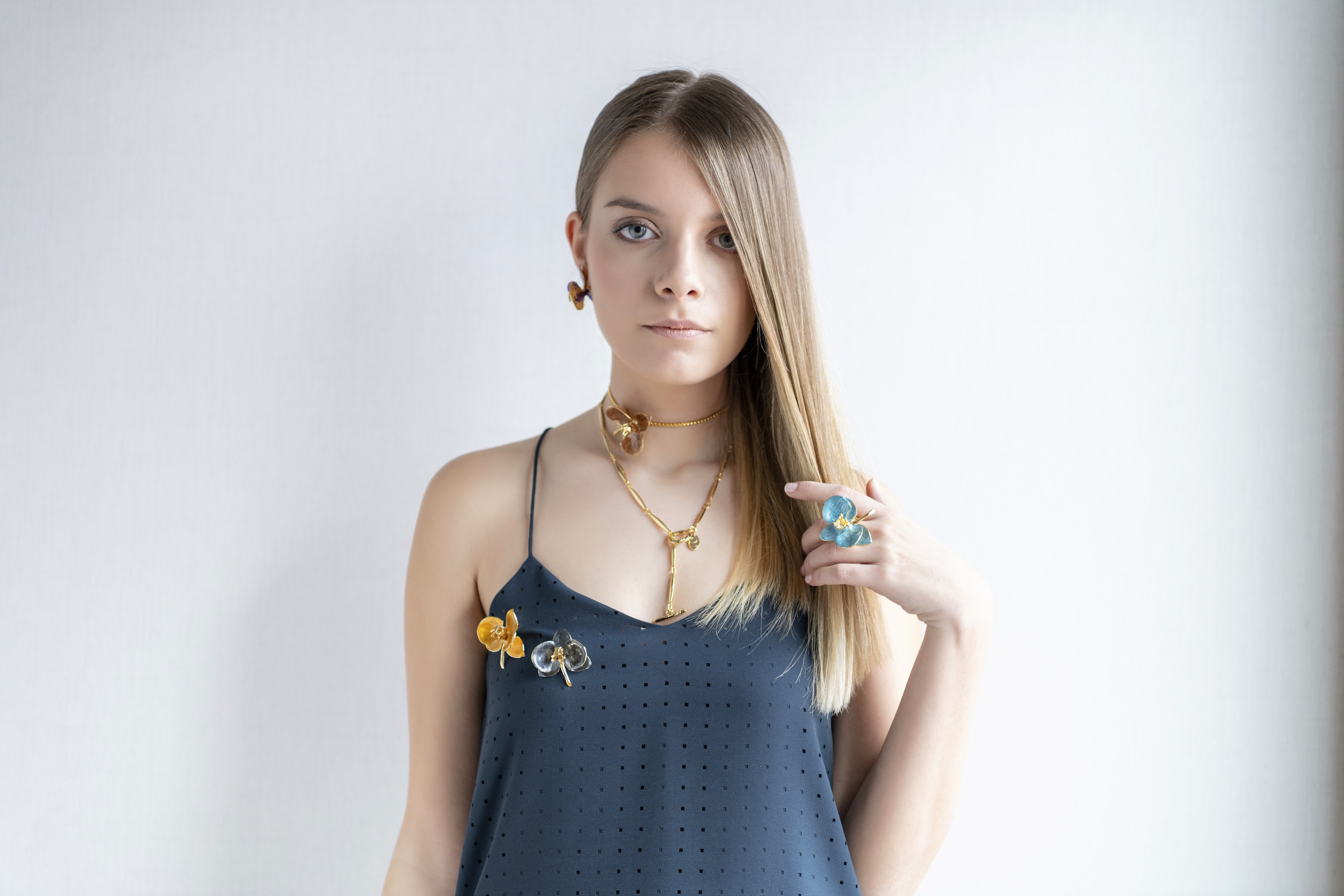 Yarı değerli taşlarla bezenmiş takılarımı, el yapımı bronz üzerine altın kaplama ile oluşturdum ve renklendirirken zamansız mine ile süsledim. Özellikle materyal olarak bronz kullanmak istedim. Çünkü gümüş gibi hiç kullanılmasa bile, havayla temas ettiğinde bile oksitlenip, kararsın istemedim. Bronzun üzerindeki altının ‘suyuna batma’sını değil, altın ‘kaplama’sını istedim. Bu yüzden aylarca; sanatkar dostum, ustam ile altın kaplamacılarını gezdim. Denizden bir kova su alıp, bütün gece kaplattığımız takıları bekletiyordum. Sabah takının bozulması sonucunda beş adet kaplamacı değiştirdik. Sonunda deniz suyundan bozulmayan takılar elde ettik. Bütün koleksiyon tek tek el işçiliğiye hazırlanıyor.