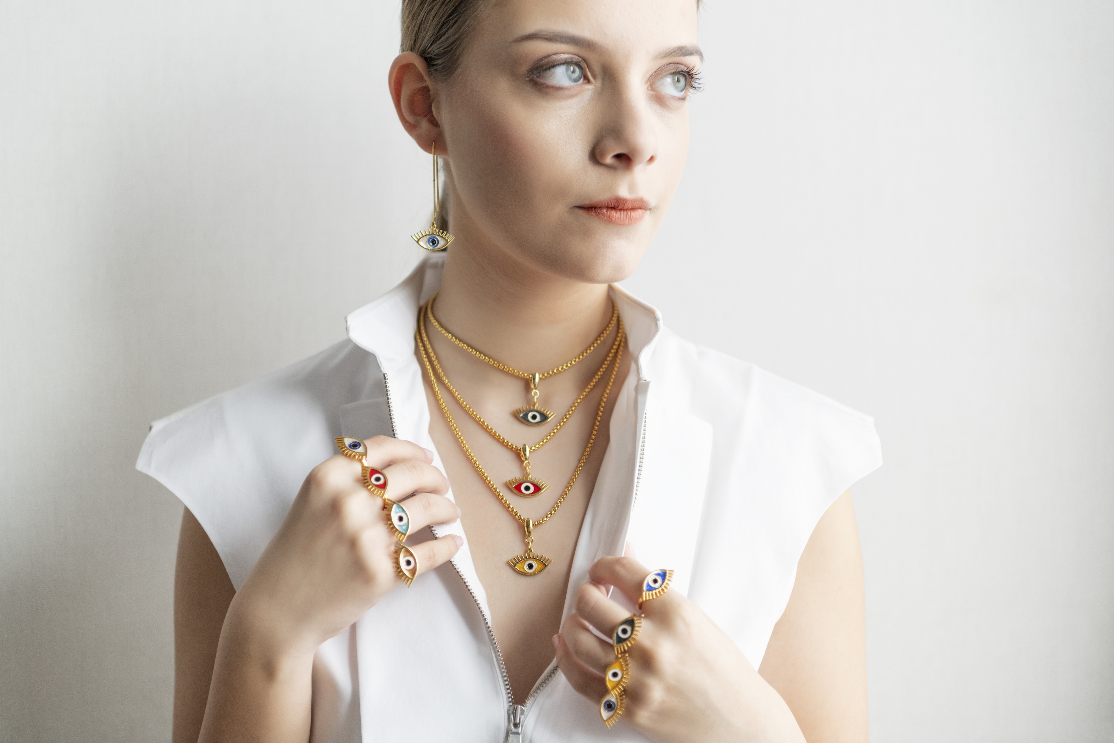 Tüm koleksiyonumun imzalı ürünleri boynumuzun taçları… Uzun, kısa yollarımız; zincirler ve onların ucundaki mesajlar… Takı tasarlamaya karar vermeden önce, iş hayatımda konferans verirken; benim görüntümün önüne geçmeyecek ama tarzımın farkını gösterecek, çok abartılı olmayan, ama klasik zincir görüntüsünden de uzak farklı figürlerde zincirler  takmak isterdim. Hep derdim ki; neden şöyle farklı farklı zincirler yapmazlar ki?. Bu arayışı yaşayan bir kadın olarak, mutlaka çeşit çeşit zincirler tasarlamalıyım dedim. Hatta onları günlük hayatımda da, üst üste farklı uzunluklarda takabilmeliyim dedim… Bu zamansız minimalist zincirleri; neden farklı kolye uçlarıyla çarpıcı hale getirmeyeyim diye düşündüm.