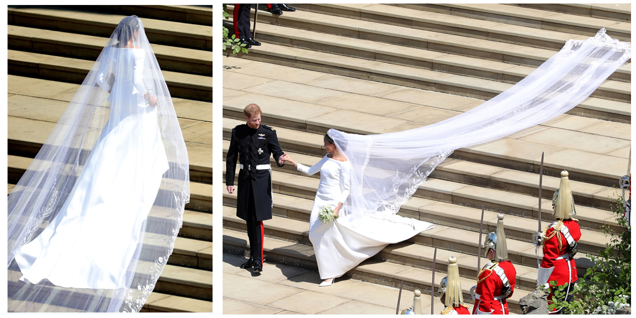 Markle, Mayıs 2018'de Prens Harry ile düğününde Clare Waight Keller imzalı Givenchy marka bir gelinlik giymeyi tercih etti. Her kraliyet gelinliğinde olduğu gibi bu gelinlikte de saklı birçok detay vardı. Meghan 2018'de verdiği bir röportajda, gelinliğin Harry ile ilk randevularında giydiği kıyafetten bir parça taşıdığını söyledi. Uzun duvak aynı zamanda, İngiliz Milletler Topluluğu'na ait 53 ülkeyi temsil eden 53 çiçek ve Kaliforniya haşhaşı işlemelerini taşıyordu.