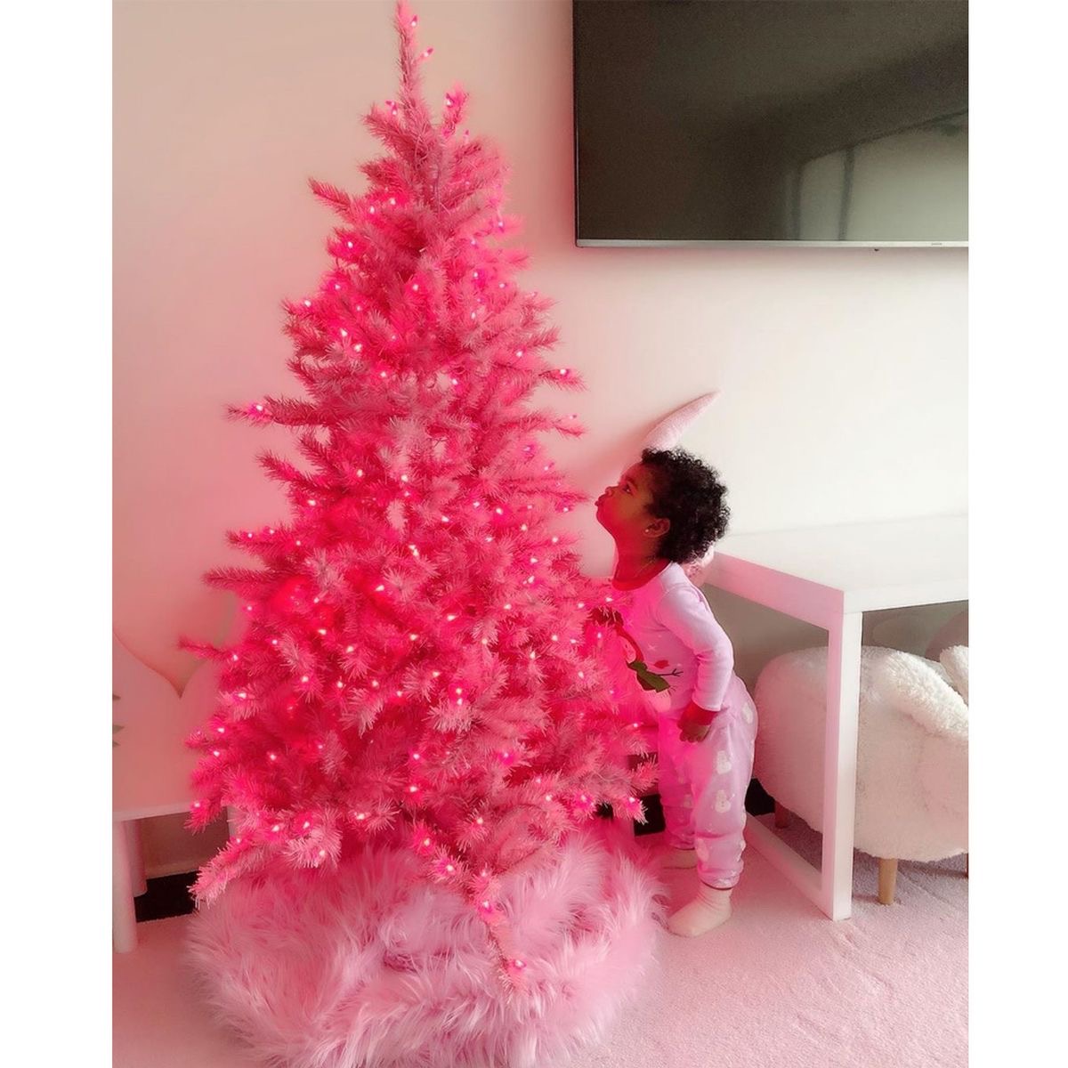 Kızı True'nun doğumundan beri Instagram sayfasında pembe bir tema kullanan Khloe, pembe aşkını yılbaşı ağacına da taşımış!
