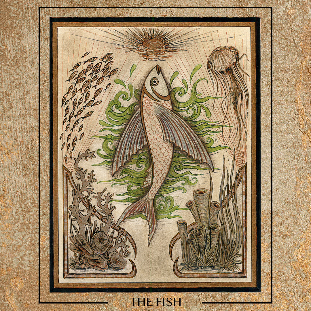 Balık: Türk mitolojisinde gök gürültüsünün hayvan biçimine bürünmüş halidir. Bolluk, bereket, refah, mutluluk ve üremenin sembolüdür. Anadolu’daki bazı efsanelere göre suya balık atmak dilekleri gerçekleştirdiği gibi dönüştürme ve kahramanca işleri yapabilme yeteneği de verir.